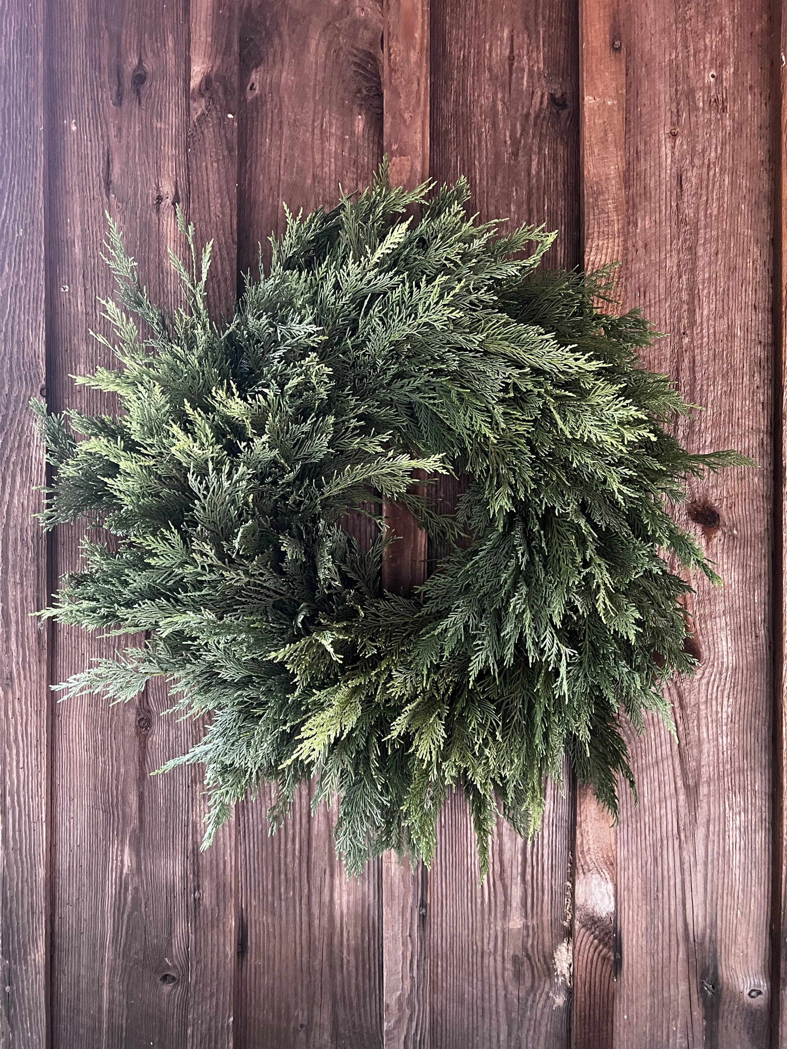 Our basic wreaths are made with leyland cypress, which lasts much longer through our mild winters. This is the base of all our wreaths.